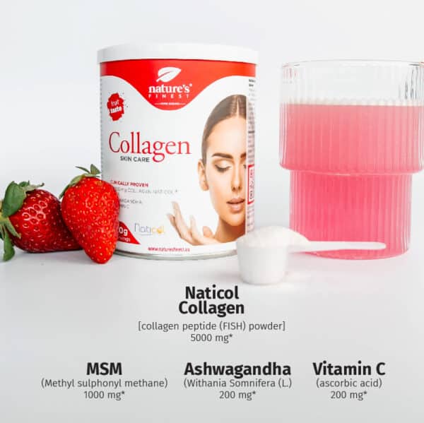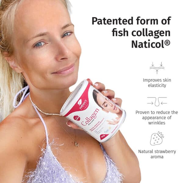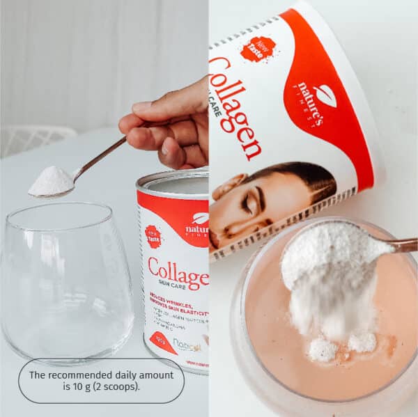 Kollagen hudpleje: Den anbefalede daglige dosis er 10g. Bland det i vand og lad det stå i 2 minutter, indtil kollagen er helt opløst. Med 10 g pulver indtager du 5 g Naticol kollagenpeptider.