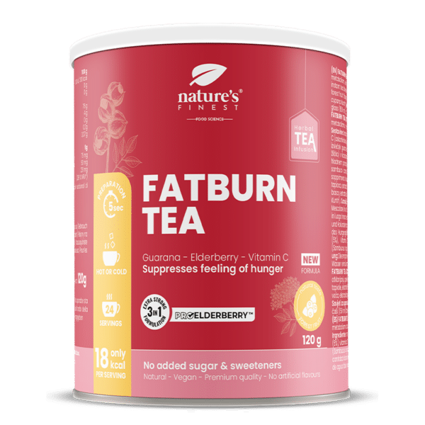 Instant te-blanding til fedtforbrænding med hyldebær, guarana-ekstrakt, hvid te og C-vitamin.