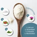 Ingredienser: inulinpulver, psylliumskal (Plantago ovata) pulver, calciumlactat, hyben (Rosa canina) pulver, chlorella (chlorella vulgaris) pulver, DigeZyme (alfa-amylase, protease, lipase, cellulase, lactase), marietidsel (Silybum marianum L., frø) ekstrakt, kamille (Matricaria chamomilla L., blomst) ekstrakt, gurkemeje (Curcuma longa, rod) ekstrakt, artiskok (Cynara scolymus L., blade) ekstrakt. Indeholder naturligt forekommende sulfitter og sukkerarter.