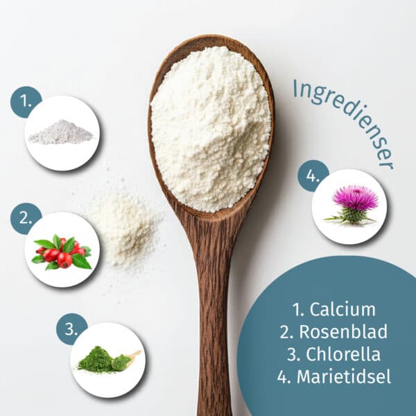 Inulinpulver, psylliumskalpulver, hybenpulver, chlorellapulver, DigeZyme, marietidselekstrakt, kamilleekstrakt, gurkemejeekstrakt, artiskokekstrakt.