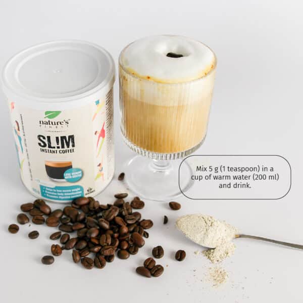 Sl!m Coffee: Hæld 200 ml varmt vand over 5 g (1 tsk) af blandingen i en kop, rør rundt og drik.